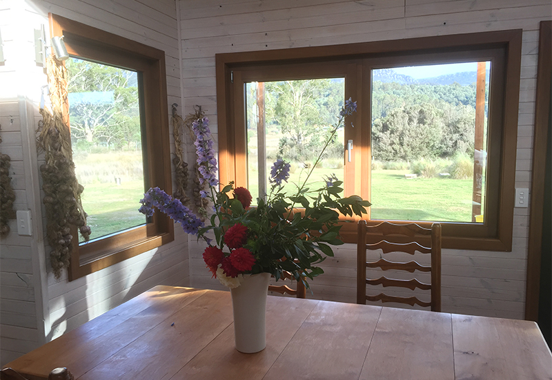 An insulated concrete slab with underfloor heating provides thermal mass and warm feet in winter with hot water from the wood stove. Using the reverse veneer building technique, the solar hall is concrete block painted in warm colours to trap heat, with an outside cladding of timber. The ceiling features R7 insulation. This energy efficient timber building envelope is completed with Paarhammer triple glazed windows and French doors.